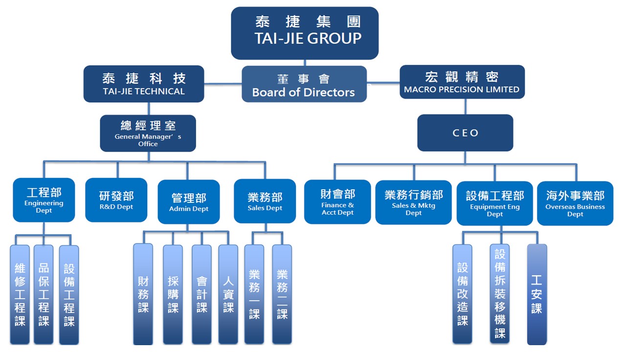 泰捷科技股份有限公司(TAI JEI TECHNOLOGY CO.,LTD)成立於2008年4月,主要為半導體及面板高科技廠真空壓力計與各類電控維修、監控系統、零件耗材販賣、 開發、功能型塗料代理銷售、設備代理&維修(後勤系統整合)。
